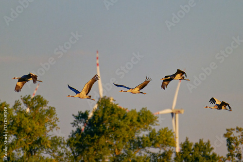 Naklejka premium Herbstzug der Kraniche in der Abendsonne