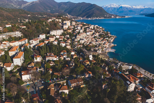 Fototapeta premium Herceg Novi town and Kotor bay, aerial drone view of Herzeg Novi panorama,...
