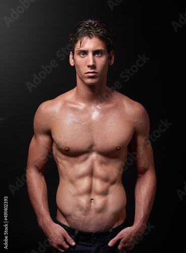 © Marius V/peopleimages.com, Fototapeta premium Herculean hunk. Studio shot of a handsome bare-chested young athlete standing against a black background.