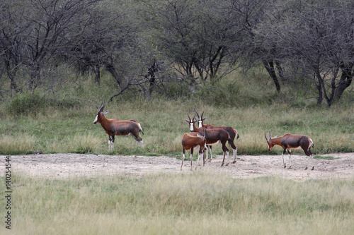 © okyela, Fototapeta premium Herd of African antelopes blesbok in Savannah. Bubaline antelope beaked