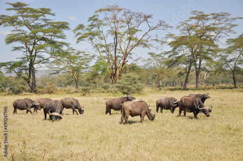 © Светлана Акифьева, Fototapeta premium herd of buffaloes on an open grassy plain in national park in Kenya