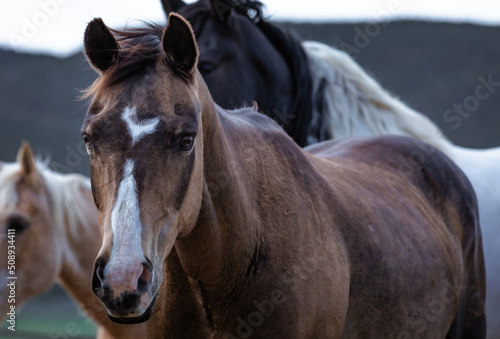 Fototapeta premium Herd of Colorado ranch horses being rounded up to move to summer pastures.
