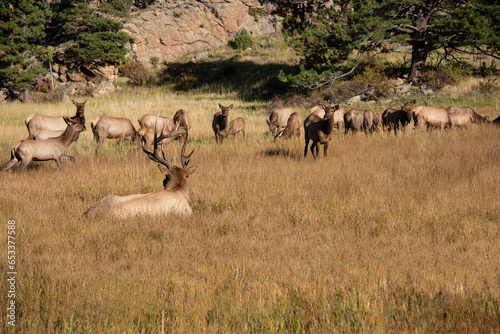 Fototapeta premium Herd of cow elk with bull elk watching over them in Rocky Mountain National...