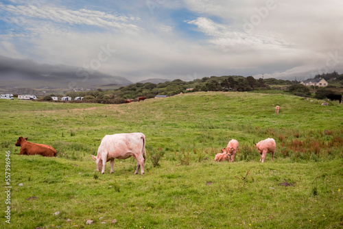 © mark_gusev, Fototapeta premium Herd of cow in a green grass field, beautiful country side with hills and blue cloudy sky in the background. Farming and agriculture industry. West of Ireland..