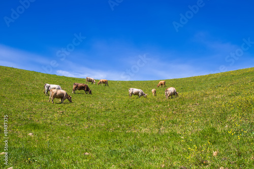 © Wead, Fototapeta premium Herd of cows at summer green field in sicily