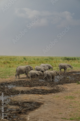 © Bahia, Fototapeta premium Herd of Elephants in African Sunset in Botswana, Linyanti Region in the Chobe National Park