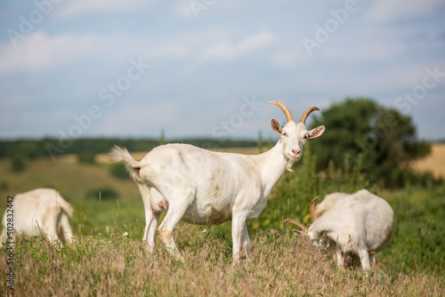 © Volodymyr Herasymov, Obraz premium Herd of farm goats on a pasture.