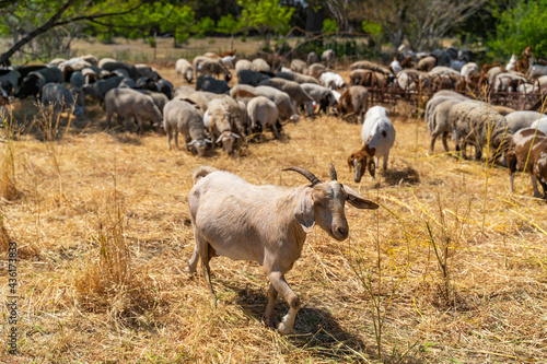 © Olga, Obraz premium Herd of goats and sheep graze on the farm.
