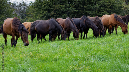 © Fotema, Fototapeta premium Herd of horses grazing grass on meadow pasture in wild Beskid Niski mountains area. Hucul pony breed horses.