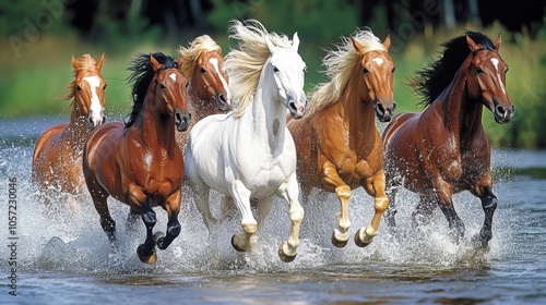 Fototapeta premium Herd of Horses Racing Through Flowing River Landscape
