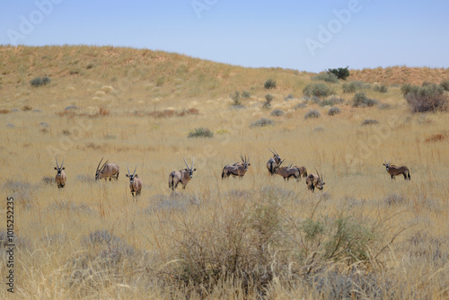 Naklejka premium Herd of oryx in the desert at the Kgalagadi national park, South Africa