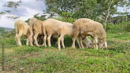 © sangart, Obraz premium Herd of Sheep Eating Grass in The Meadow. Central Java Indonesia.