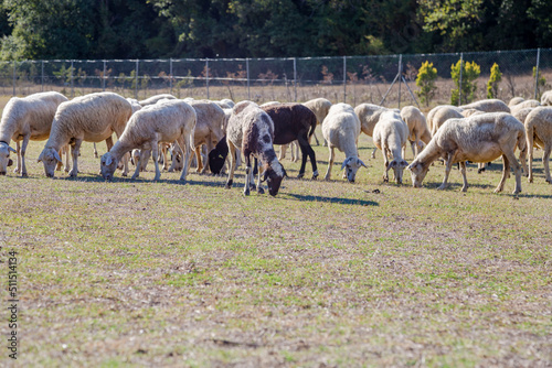 © berna_namoglu, Fototapeta premium herd of sheep feeding or grazing on meadow in a farm