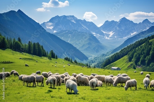 Fototapeta premium Herd of sheep grazing landscape grassland livestock.