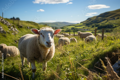 Obraz premium Herd of Sheep in a Grass Pasture in Ireland