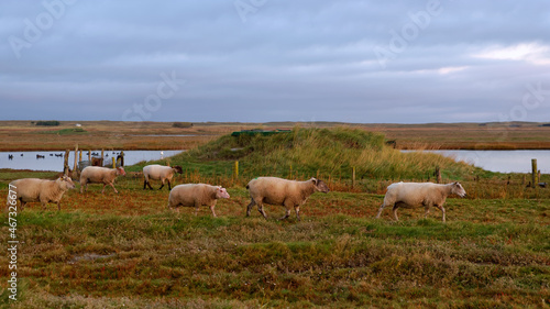 © hassan bensliman, Fototapeta premium Herd of Sheep in salt marshes. Bricqueville-sur-Mer village