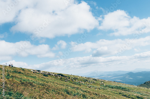 Naklejka premium Herd of sheep on beautiful mountain meadow
