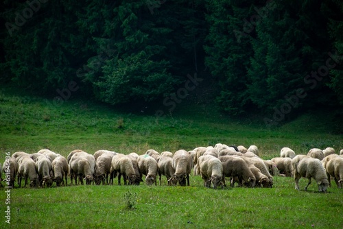 © Andrei Alexandru/Wirestock Creators, Obraz premium Herd of sheep standing next to each other on a lush green hillside