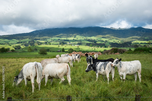 © Nathan McClunie, Fototapeta premium herd of speckle park cattle grazing in lush green grass field with mountain backdrop