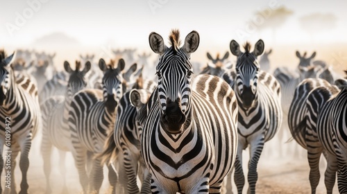 Fototapeta premium Herd of striped zebras standing in wild dusty desert at sunlight. Black and white animals look ahead grazing in savanna on sunny day generative AI
