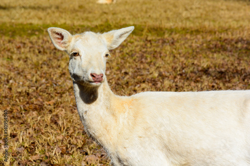 Naklejka premium Herd of white fallow deer in nature at sunset. Fallow deer in rut. Latin name - Dama dama. Rare albino fallow deer.