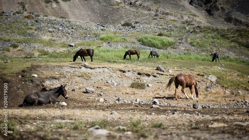 Fototapeta premium Herd of wild horses on pasture in mountain area