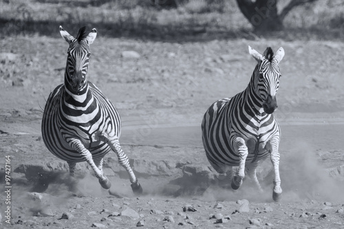 © Alta Oosthuizen, Fototapeta premium Herd of zebra fleeing from danger at dusty waterhole artistic co