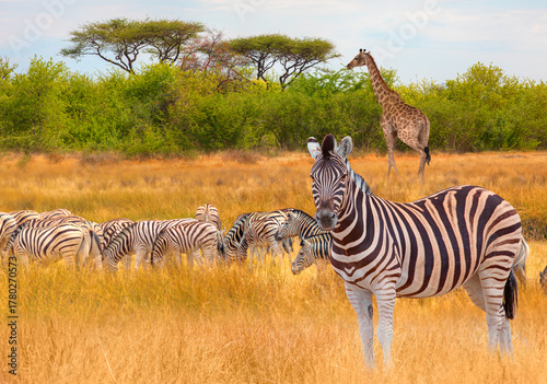 © muratart, Obraz premium Herd of zebra grazing in the open savannah with a lone giraffe - Ethosa national park - Namibia, Africa