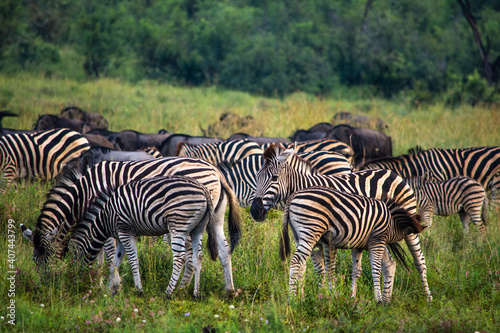 © Hislightrq, Fototapeta premium Herd of zebra with nursing foal in the front
