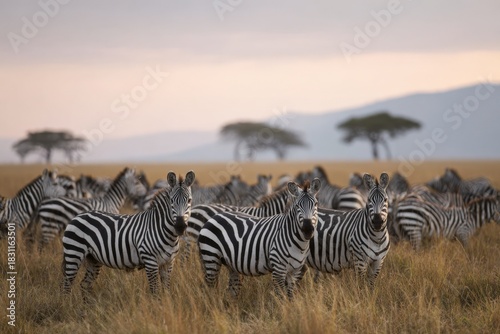 © Andrii Zastrozhnov, Naklejka premium Herd of zebras in african savanna at sunset with acacia trees in background