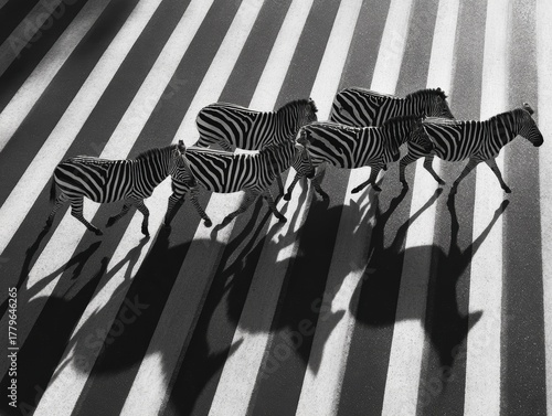 © Taras, Obraz premium Herd of zebras running on graphic black and white stripes, abstract animal group, high contrast photo. Diagonal lines, top-down perspective, movement and rhythm concept