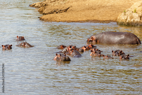 Fototapeta premium Herd with Hippos in a river