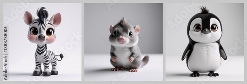 Fototapeta premium Here is the requested description and keywords:The image presents three adorable cartoon animals, each on a white background. There's a charming zebra, a cute mouse and a penguin. They each have big