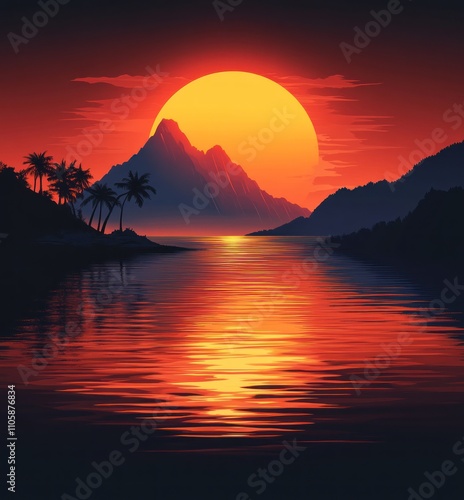 Naklejka premium Here's a and keyword list for your image.. Vibrant sunset over tropical island, reflecting on calm water.