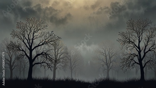 Obraz premium Here's a description and keywords for your image.. Eerie, fog-shrouded forest with bare trees under a cloudy sky.