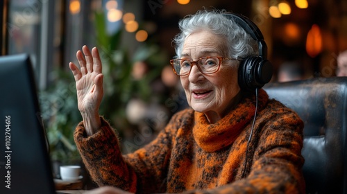© Ashalina, Obraz premium Here's a description following your specificationsSenior woman video chatting, smiling, waving.