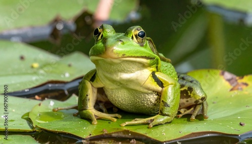 © Abdul, Fototapeta premium Here's a prompt tailored for generating a **cute, large green frog sitting on a lily pad**:---**Prompt:**> "A large, cute green frog sitting peacefully on a big lily pad in the middle of a calm