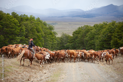 © Santa001, Obraz premium Hereford cattle ranch in south patagonia argentina