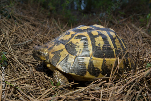© antasfoto, Obraz premium Hermann's tortoise, Testudo hermanni. Pine forest at Lake Baratz. Sassari, Sardinia, Italy
