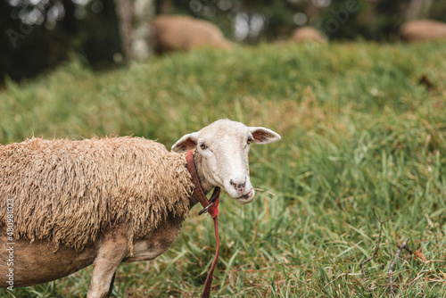 Obraz premium hermosa oveja blanca pastando y mirando a cámara