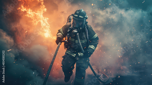 Fototapeta premium Heroic Firefighter in Black Refractory Pants Running with Hose, Smoke Billowing Behind
