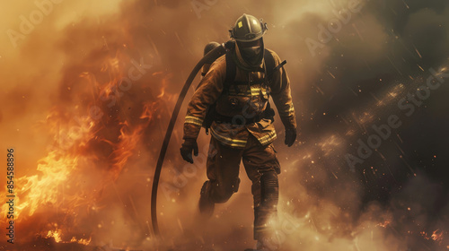 Fototapeta premium Heroic Firefighter in Black Refractory Pants Running with Hose, Smoke Billowing Behind