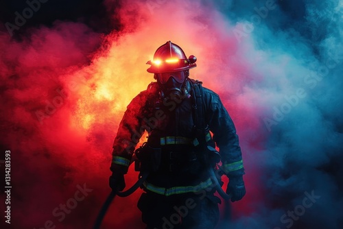 © mobile, Naklejka premium Heroic Firefighter in Vibrant Smoke with Axes and Gear