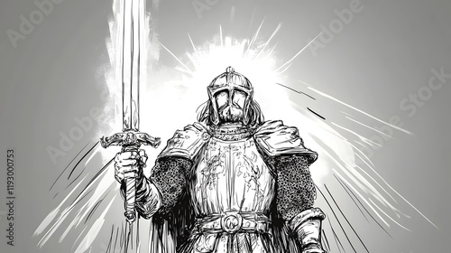 Fototapeta premium Heroic Knight in Ornate Armor Wielding Glowing Sword,Epic Fantasy Character...