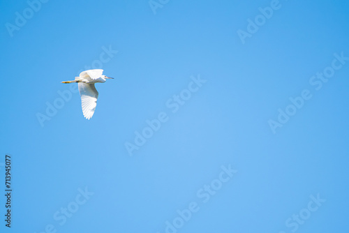 Fototapeta premium Heron, beautiful white heron flying in the blue sky, selective focus.