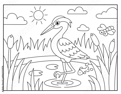 Obraz premium Heron Coloring Page for Kids – Pond Life and Nature Scene