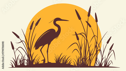 Naklejka premium Heron Silhouette in Reeds at Sunset Peaceful Wildlife Nature Scene for Environmental Conservation Tourism Wellness and Outdoor Branding