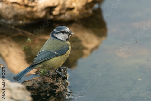 © JOSE ANTONIO, Obraz premium herrerillo común posado en una piedra junto al estanque del bosque (Cyanistes caeruleus)