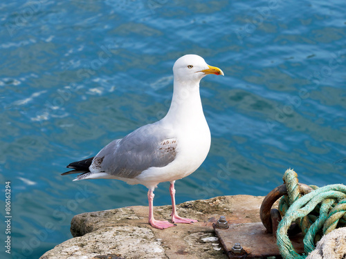 Fototapeta premium Herring gulls at Lyme Regis harbour against calm blue waters with boat ropes and lines