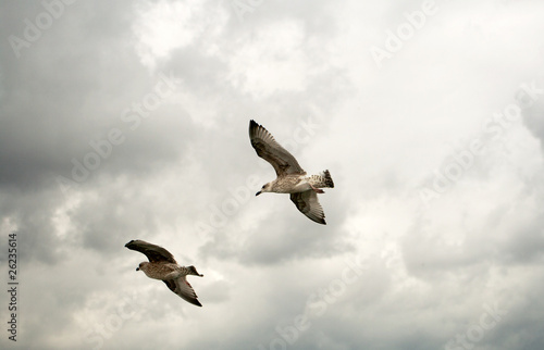 © Sally Wallis, Obraz premium Herring Gulls flying over ferry